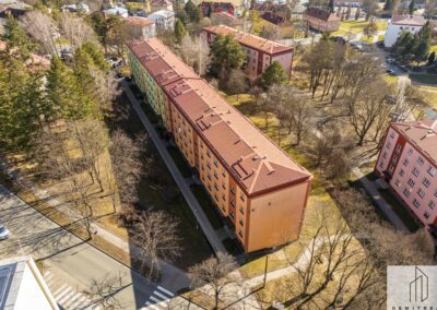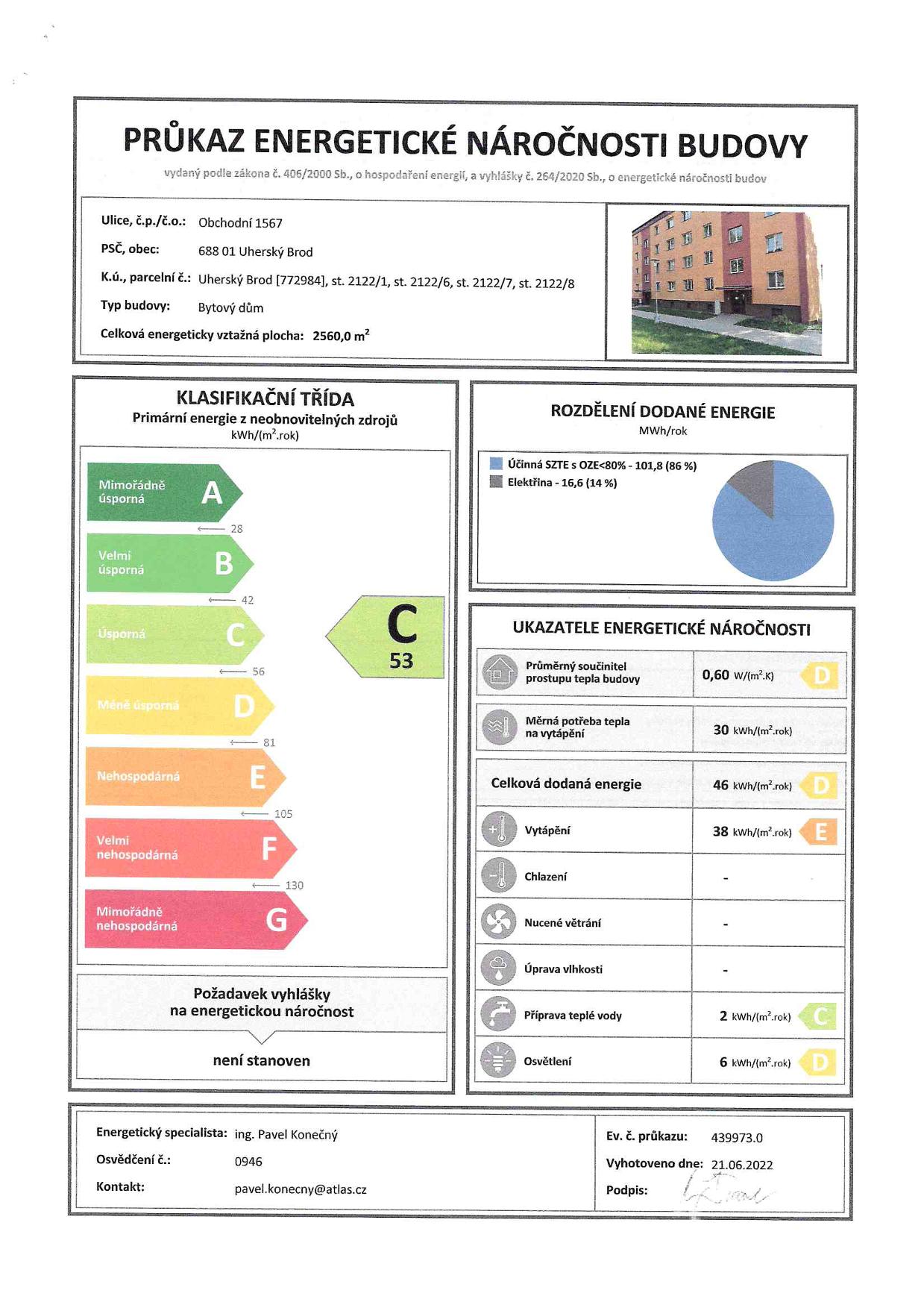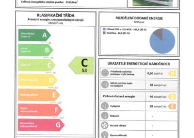 Bytový dům pochází z r. 1970 a prošel revitalizací – zateplením (polystyren 100 mm), okna jsou plastová. Dle průkazu energetické náročnosti budovy se objekt řadí do třídy C – úsporná. Na bytovém domě nevázne žádný úvěr. Měsíční poplatky činí celkem 3.600 Kč (500 Kč zálohy na elektřinu, 3.100 Kč předpis bytového družstva).