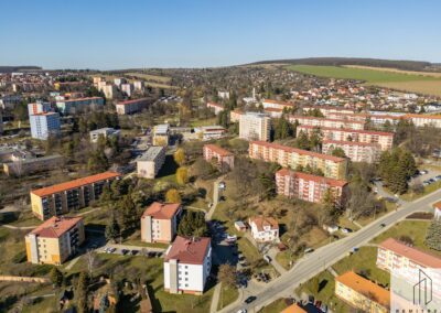 Dům je obklopen zelení a v jeho blízkosti nalezneme několik dětských hřišť. Ve vzdálenosti cca 200 metrů se nachází mateřská škola. Pouhé tři minuty chůze zabere návštěva potravin HRUŠKA, pivnice, cukrárny či kina. Autobusová zastávka leží cca 180 metrů od domu. Do centra města dorazíte autem za tři minuty, pěší chůze zabere přibližně 20 minut.